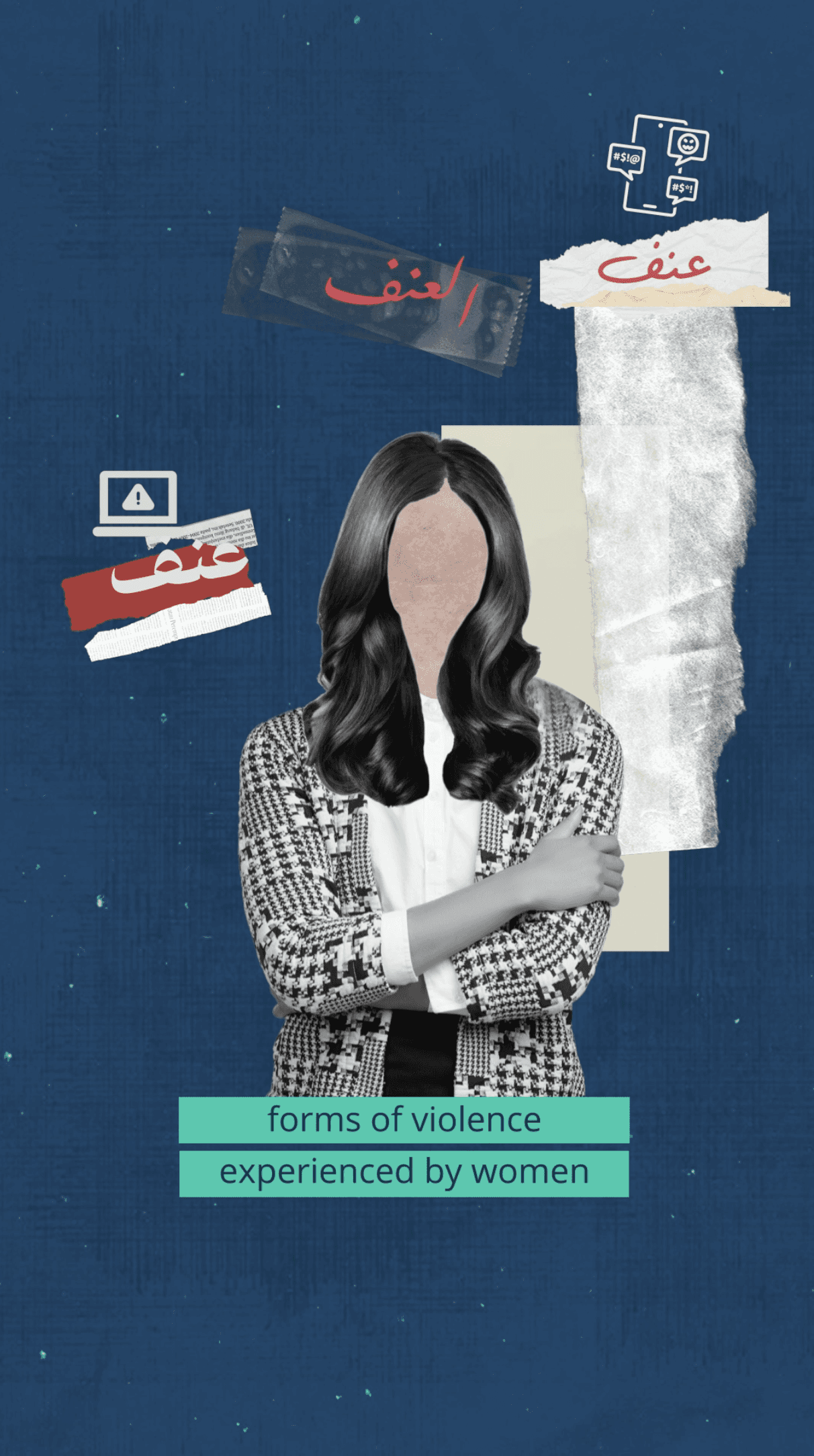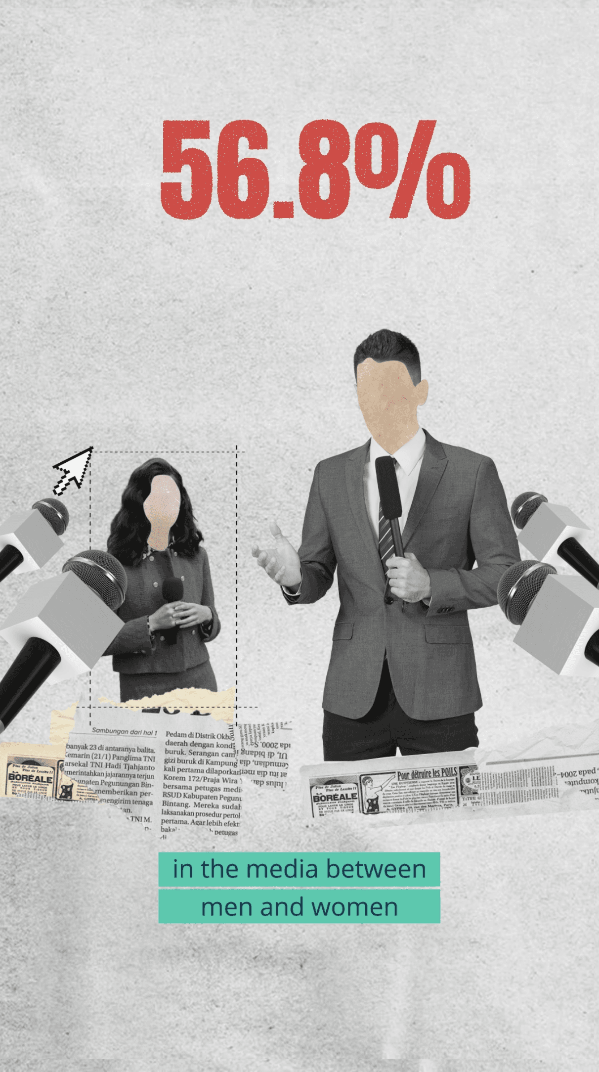 Bold collage and mixed-media elements to reflect the fragmented reality of women in politics. Cut-out figures, textures, and torn paper symbolize silenced and interrupted voices, while anonymized faces shift the focus from individuals to a shared, systemic experience. S trong typography and data-led visuals ground the message in credibility, creating a raw, editorial aesthetic that confronts the issue honestly and without softening its impact.